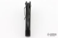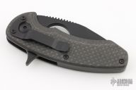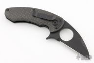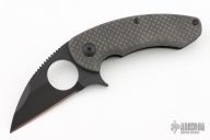This Silent Soldier by Brous Blades features a black wharncliffe style blade with swedge, notched thumb rest, finger hole and flipper. The handle is comprised of carbon fiber scales over black coated titanium liners and blackened steel backspacer. Black coated steel tip down clip. Signed "J. Brous" inside backspacer. Excellent condition.