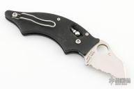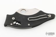 This DoDo from Spyderco features a satin finished serrated hawkbill blade with thumbhole. The handle is black G10 with a tip up clip, right or left carry. Axis style lock with steel ball. Has a couple light scuffs, otherwise excellent condition.