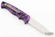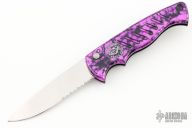 The Pocket by Piranha Knives features a stonewashed drop point partially serrated blade with splash finish aircraft aluminum handle with tip up clip. Excellent condition.