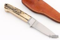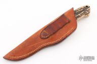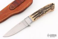 This drop point hunter by Claude Montjoy features a hand rub satin finished blade, .152" blade stock, .986" blade depth, full tapered tang construction. The handle has a stainless steel guard with stag scales over red liners. Includes a brown leather sheath. Has a few light scratches, otherwise excellent condition.