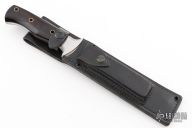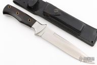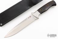 This SERE fixed blade from Al Mar Knives features a double edged blade and serrations on top, .192" stock and 1.371" depth, full tang construction. The handle has black/brown paper micarta scales, brass tube pins over red liners, stainless steel bolsters. Comes with original black leather sheath with stone. Has a couple light scratches, otherwise excellent condition.