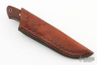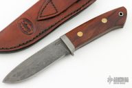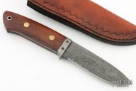 This fixed blade from Wild Bill Caldwell features a drop point Damascus blade with 200" blade stock and 1.074" blade depth, . The handle is comprised of a damascus guard and wood scales with brass pins and stainless steel lanyard tube over full tapered tang construction. Comes with a hand tooled brown leather sheath. Excellent condition.