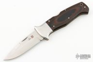 This SERE folder from Al Mar Knives features a satin finish drop point blade with false top edge and nail nick. Satin finish bolsters, brown/black paper micarta scales over brass liners. Opens and closes with a nice snap. Comes with a nylon belt sheath. Has some scratches, otherwise good condition. Pre Production #040 of 200