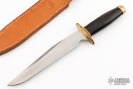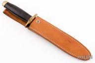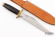 This knife by John Nelson Cooper was made for Bianchi, it features a satin finished blade with false top edge, .174" blade stock and 1.277" blade depth, hidden tang construction. The handle has brass guard and butt,stacked black linen micarta grip. Comes with a brown leather sheath. Has some scratches and patina, otherwise good condition.
