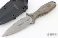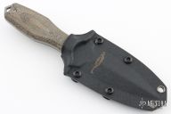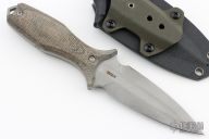 This Specter by NC Custom features a double edged stonewash finished X-105 steel blade, .158" blade stock and 1.272" blade depth, full tang construction. The handle has black/green linen micarta scales. Comes with a kydex sheath. Has a few light scuffs, otherwise excellent condition.