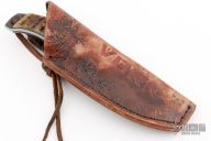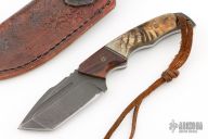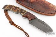 This Rkkr by Vorn Knives features a drop point tanto blade with a distressed finish, .184" blade stock and 1.265" blade depth, full tang construction. The handle has ironwood bolsters with sheep horn scales with black liners. Comes with a brown leather sheath. Has a couple light scuffs, otherwise excellent condition.