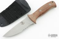 This Air Assault Knife by Gary LeBlanc features a bead blast finished partially serrated blade with .154" blade stock, 1.257" blade depth, full tapered tang construction with contoured natural canvas micarta handle. Comes with kydex sheath. Has some light sheath marks, otherwise excellent condition.
