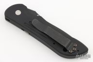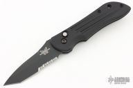 Black coated partial serrated tanto blade, black machine grooved, contoured handle, index finger notch, filed thumbrest. Button activated open/close auto with an integrated spine mounted slide safety. Comes with original box and paperwork. Excellent condition.