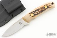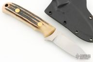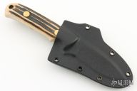 This K-31 Arkansas Traveler by Dozier Knives features a satin finished blade with .127" blade stock and .869" blade depth, full tang construction. The handle has stag scales with brass pins and lanyard hole. Comes with kydex sheath with belt clip. Excellent condition.