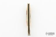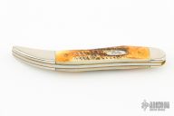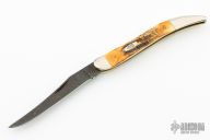 This Toothpick by Case Knives features Damascus blade with nail nick. The handle has nickel silver bolsters, stag jigged bone covers, brass liners, and a stainless spring. Excellent condition. Comes with original box and papers.
