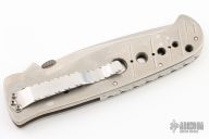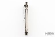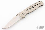 This knife features a satin finished drop point recurved blade with a knurled thumb disc and a notched thumbrest.  The handle has a titanium frame with a stainless steel tip down pocket clip.  Light scratches are visible otherwise the knife is in good condition.