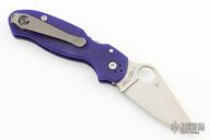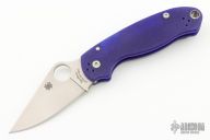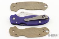 This C223GPDBL Para 3 by Spyderco features a satin finished clip point blade with thumb hole and notched thumb rest. The handle is comprised of a G10 frame over nested steel liner and stand offs. The steel pocket clip is 4 way adjustable. Deep carry clip. Includes original box, clip and paperwork. Excellent condition. Comes with a set of Putman Spyderco Para 3 Green Canvas Micarta Scales.