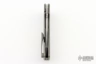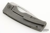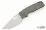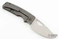 This knife by the OZ Machine Company features a tumbled Magnacut blade with thumbhole and notched thumbrest. The handle features a smooth stonewashed titanium frame with a titanium backspacer and tip up pocket clip with hidden screws. Includes box and papers dated 10-7-22 and s/n 1006. Excellent condition.
