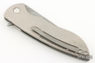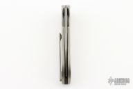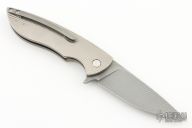 This Sting Flipper by Herman Knives features a tumbled Balbach Damasteel blade and flipper. The handle has a milled titanium frame, titanium liner and tip up clip and carbon fiber backspacer. Nice detent, lockup and blade seating. Rides on bearings.  Comes with original box and COA. Excellent condition.