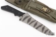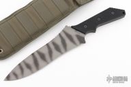 This AJAX by Mick Strider features a spear point tiger striped blade with false top edge and notched thumbrest, .253" blade stock and 2.549" blade depth, full tang construction with textured black G-10 scales. Comes with a green nylon sheath. New from maker at the 2023 CCKS.