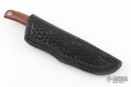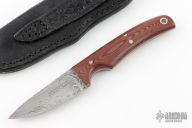 This knife by Gordon Romeis features a Damascus blade, .100" blade stock and .887" blade depth, full tang construction. The handle red linen micarta scales.  Comes with a hand tooled black leather sheath. Has some light spots, otheriwse excellent condition.