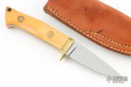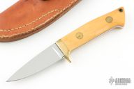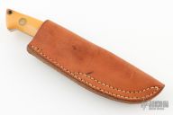 This Knife by Russell Easler features a mirror finished blade, .113" blade thickness and .757" blade depth, full tang construction. The handle has a brass guard, yellow paper micarta scales with brass pins and black liners. Comes with a brown leather sheath.  Excellent condition.