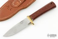 This knife by Ed Martin features a satin finished blade with .167" blade stock and 1.026" blade depth, hidden tang construction. The handle has a brass guard, brown canvas micarta grip with brass/black spacers, has lanyard hole. Comes with black leather sheath. Excellent condition.