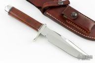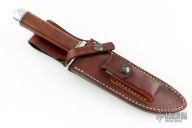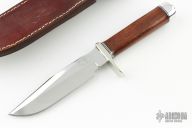 This knife by Martin Knives features a mirror finished blade with sharpened top edge, .209" blade stock and 1.255" blade depth, hidden tang construction. The handle has a nickel silver guard, rosewood grip with aluminum/black spacers, has an aluminum butt. Comes with brown leather sheath. Excellent condition.