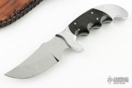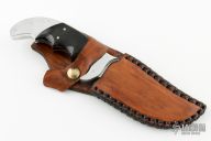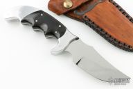 This skinner features a mirror polished blade with .155" blade stock and 1.493" blade depth, full tang construction. The handle has aluminum bolsters, black linen micarta scales. Comes with a brown leather sheath. Has some spots on the blade, otherwise good condition. The knife is marked "FC", please let us know if you know who this is.