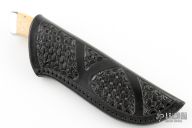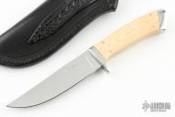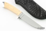 This knife by D Arvel features a mirror polished blade with .193" blade stock and 1.008" blade depth, full tapered tang construction. The handle has a stainless steel guard and butt with yellow paper micarta scales. Comes with a hand tooled black leather sheath. Excellent condition.