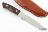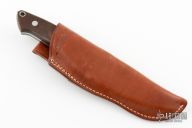 This Loveless Design Utility Fixed Blade has a satin finished clip point blade, with full tapered tang construction, .159" blade stock, .936" blade depth. The blade, guard, and tang are forged from one piece of stainless 440B. Well contoured brown micarta handle fits comfortably in the hand. Polished aluminum pins, and aluminum lanyard tube pin. Excellent condition with brown leather sheath.