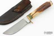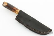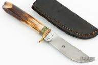 This knife features a satin finished blade with .161" blade stock and 1.020" blade depth, hidden tang construction. The handle has a brass guard and a steel butt, stag grip with a maple burl spacer. Comes with a brown leather sheath. Has some oxidation spots on the blade, otherwise good condition.