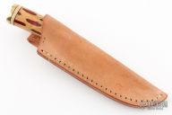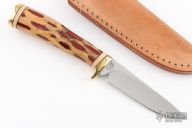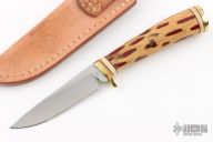 This Hunter by RW Wilson features a satin finished drop point blade, .125" blade stock and .929" blade depth, hidden tang construction. The handle has a brass guard and butt, stabilized cactus grip with black and ivory paper micarta spacers. Comes with a brown leather sheath. Excellent condition.  #71713