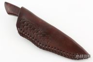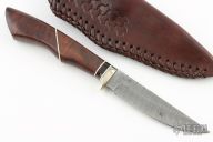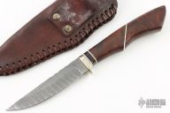 This hunter by Roger Shirley features a Damascus blade with fileworked thumbrest, .125" blade stock and .856" blade depth, hidden tang construction. The handle has a nickel silver guard, ironwood grip with black and white spacers. Comes with a hand tooled brown leather sheath. Has an oxidation spot on the blade, otherwise excellent condition.