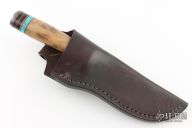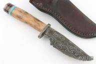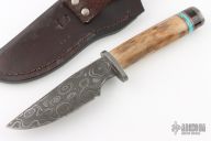 This Hunter from Stek Knives features a Damascus blade with false top edge, .222" blade stock and 1.464" blade depth, hidden tang construction. The handle is comprised of a Damascus guard, oosic grip, Damascus pommel, brass/red/turquoise/buffalo horn spacers. Includes a brown leather sheath dated 2002. Has some light oxidation on the blade edge, otherwise excellent condition.