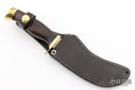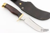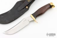 This hunter by the Late Frank Centofante features a satin finished blade with .190" blade stock and 1.201" blade depth, hidden tang construction. The handle has a brass guard and butt with wood grip, black spacers. Comes with a black leather sheath. Has scratches, has a nick in the blade edge, has been resharpened, otherwise good condition.