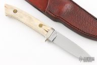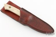 This knife by WT Fuller features a mirror finished blade with fileworked spine, .164" blade stock and .996" blade depth, full tapered tang construction. The handle has a nickel silver guard, stag scales with brass pins, fileworked tang. Comes with a hand tooled brown leather sheath. Excellent condition.