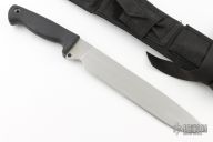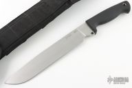 This Basic 10 Limited Edition from Busse Combat Knife Company features a satin finish drop point blade .221" blade stock and 1.616" blade depth. The handle is comprised of a Resiprene C grip over hidden tang construction. Lanyard hole in pommel. Numbered #371 on blade. Has scuffs and scratches, has been used, otherwise good condition. Comes with a black nylon sheath.