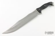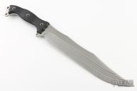 This Nuclear Forsaken Battle Mistress by Busse features a competition finished INFI blade with corrugated bevel technology and fullers, .249" blade stock and 2.115" blade depth, full tang construction. The handle has hand shaped black/tan G-10 scales, extended tang with lanyard holes. Has a couple scratches, otherwise excellent condition.
