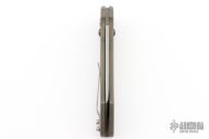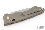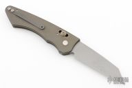 This Waco automatic by Rob Dalton features a bead blasted and chisel ground wharncliffe blade and grey aluminum frame. Bead blast titanium clip, tip up carry. Side opening, coil spring. The bar lock release is used to open and close the knife and can be operated with either hand. Numbered 244 on back of frame. Has a few light scuffs and stains on the blade, otherwise excellent condition.