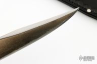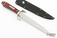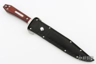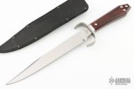 This is a discontinued Bill Bagwell designed Bowie, made by Ontario Knife, features a mirror finished blade with sharpened top edge, .295" blade stock and 1.349" blade depth, hidden tang construction. The handle has a stainless steel guard, wooden coffin shaped handle with nameplate. Comes with original black leather sheath. Has some scrtches, has been resharpened, otherwise good condition.