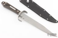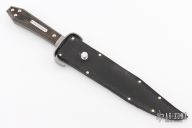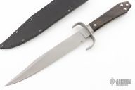 This is a discontinued Bill Bagwell designed Fortress Bowie, made by Ontario Knife, features a bead blasted blade with sharpened top edge, .308" blade stock and 1.348" blade depth, hidden tang construction. The handle has a bead blasted stainless steel guard, wooden coffin shaped handle with nameplate. Black leather sheath. Excellent condition.