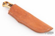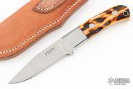 This Hunter by John Young features a mirror polished blade with .152" blade stock and .939" blade depth, full tapered tang construction. The handle has a mirror polished stainless bolsters, stag scales and red liners. Lanyard hole at butt. Comes with brown leather sheath. Excellent condition.