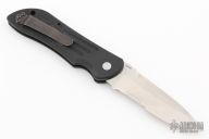 This Stryker Auto has a tumble finished 154CM drop/ spear point blade with false top edge, partially serrated edge and notched thumb rest. Handle is black anodized aluminum with black stainless steel tip up clip, lanyard hole, and safety on the spine. Solid action and lockup. Includes the original box and papers. Light scratches otherwise the knife is in Excellent condition.