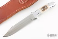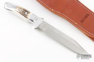 This Model 25AC Custom Workman by Ruana knives features a satin finished clip point blade with sharpened top edge, .176" blade stock and 1.124" blade depth, hidden tang construction. The handle is cast from aluminum with elk horn inserts. Comes with a brown leather sheath.  Excellent condition.