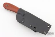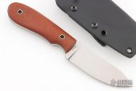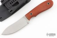 This fixed blade from Bill Siegle features a drop point satin finish blade with flat grind and visible temper line, .190" blade stock and 1.136" blade depth, full tang construction. The handle has brown paper micarta scales with lanyard hole in pommel. Includes kydex sheath. Has a light sheath mark on the blade, otherwise excellent condition.