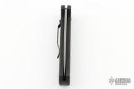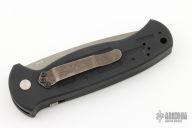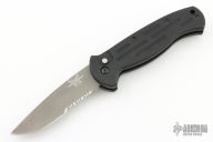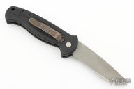 This knife features a bead blasted partially serrated blade. The handle has a black aluminum frame with a tip down stainless steel pocket clip. Includes the original box, papers and a nylon sheath. Light scratches are visible on the pocket clip otherwise the knife is in excellent condition.