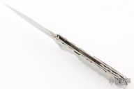 This Rainmaker by Olamic Cutlery features a mirror finished blade with a notched flipper. The handle has a contoured and polished titanium frame with matching titanium tip up pocket clip and titanium backspacer. Nice detent, blade seating and lock up. Includes original zippered case and COA dated 8-19-2019. Has some light scratches, otherwise excellent condition.
