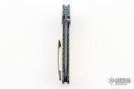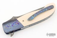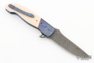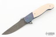 This Dress Tactical Flipper from Larry Newton features a Stainless Damascus blade with a single thumbstud and flipper. The handle has ZircoTi bolsters and tip up clip, ivory paper micarta scales, anodized and fileworked titanium liners, and an engraved stainless backspacer. Smooth action on bearings with a nice detent, lockup and blade seating. Excellent condition.