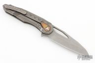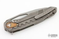 This Sigil MK6 by Microtech Knives features an Apocalyptic finished blade with thumb hole and flipper, notched thumbrest. The handle has an Apocalyptic finished titanium frame, tip up clip and backspacer with a distressed copper overtravel stop, stainless lockface insert. Comes with original box and papers. S/N 0034 and dated 12/2016. Excellent Condition.