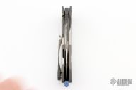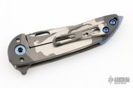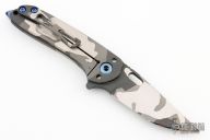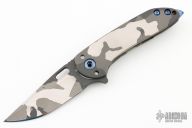 This SYJ-1 Flipper by Direware Custom Knives features a camo multi-ground blade with notched thumbrest, thumbhole and a flipper. The handle has a matching titanium frame with a matching tip up clip, anodized titanium pivot, screws and backspacer. Rides on bearings, nice detent, lockup and blade seating. Comes with original box and card. Excellent condition.