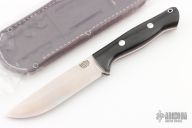 This Bravo-1.25 LT by Bark River Knives features a satin finished blade with notched thumbrest, .159" blade and 1.175" blade depth, full tang construction. The handle has black canvas micarta scales with red liners and aluminum pins. Comes with a brown leather sheath and original box. Excellent condition.