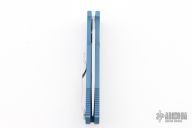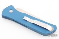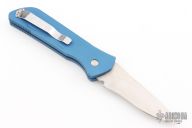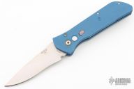 This Python side-opening automatic from Dynamic Knife Designs has a satin finish plain edge blade and a blue aluminum handle. Coil spring. Stainless steel clip. Sliding safety. Excellent condition. Comes with original box and papers.