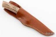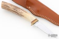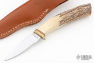 This Model C300A by Gerber Legendary Blades features a mirror polished blade with .090" blade stock and .705" blade depth, hidden tang construction. The handle has a brass guard with stag grip and red/white spacers. Comes with a brown leather sheath. Has some scuffs, scratches, and patina. Great condition otherwise.