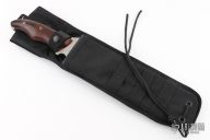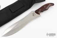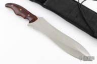This Goliath by Mercworx features a hand rub satin finished blade with sharpened top edge, notched thumbrest, .248" blade stock and 2.200" blade depth, full tang construction. Desert Ironwood burl scales with mosaic pins and red liners. Comes with black nylon sheath. Has one little nick in the butt o the handle, otherwise excellent condition.